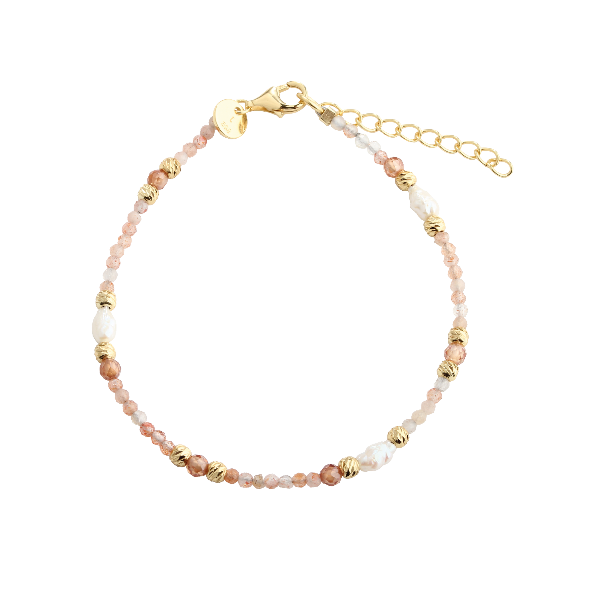 Armbånd SUNELLA SIMPLE med rosa halvædelsten, perler & twistet forgyldte sølvkugler.