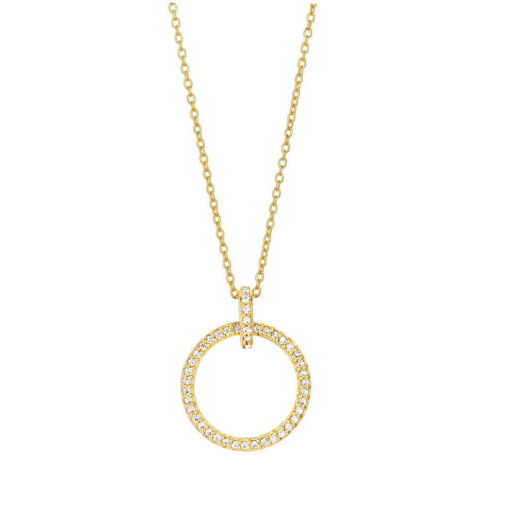 Denne smukke Trend halskæde er udformet i blankpoleret forgyldt sterlingsølv og kan lukkes ved længderne 42/45 cm. Vedhænget er designet som en åben cirkel og paveret med hvide zirkonia, hvilket skaber et elegant udtryk.
