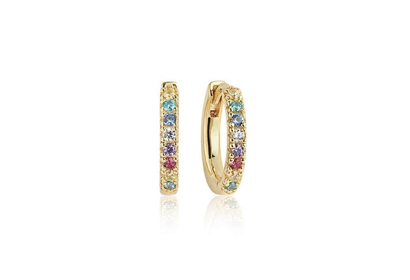 Øreringe i sterlingsølv 925 forgyldt med 18 karat guld med blankpoleret overflade og facetslebne multifarvede zirkoner. Bemærk: Sælges som par.