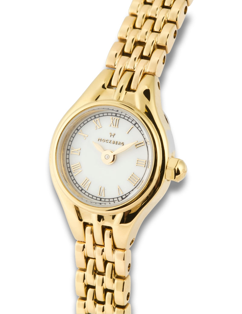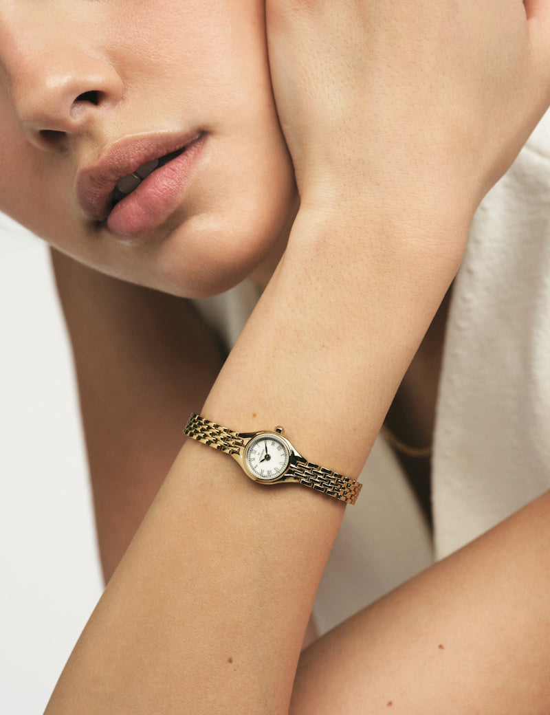 En moderne fortolkning af klassisk femininitet. Heritage Petite Watch er designet til at blive båret som et smykke – med sin delikate silhuet, romertal og skinnende guldfarvede ledarmbånd er den et sofistikeret supplement til både hverdagslooks og festlige lejligheder.
