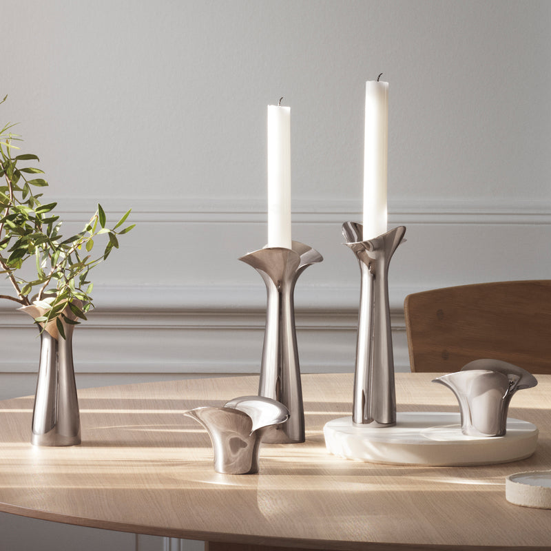 Den lille Bloom Botanica vase er i blankpoleret rustfrit stål.