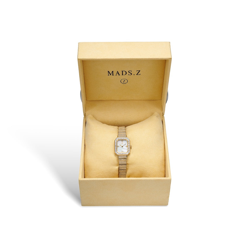 Celestial by Medina ur i PVD-forgyldt stål med baguetteslebne zirkonia, Swarovski-krystaller og urværk med schweiziske dele, diameter 32 mm.