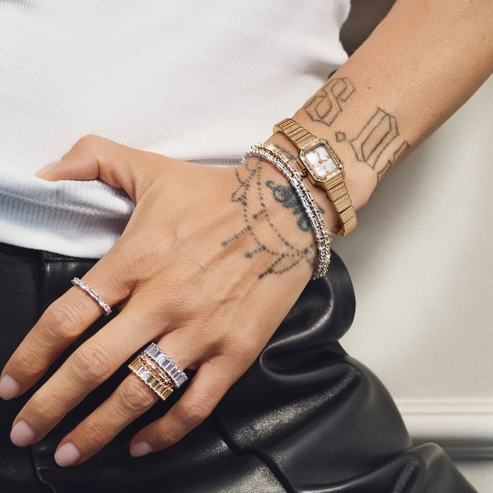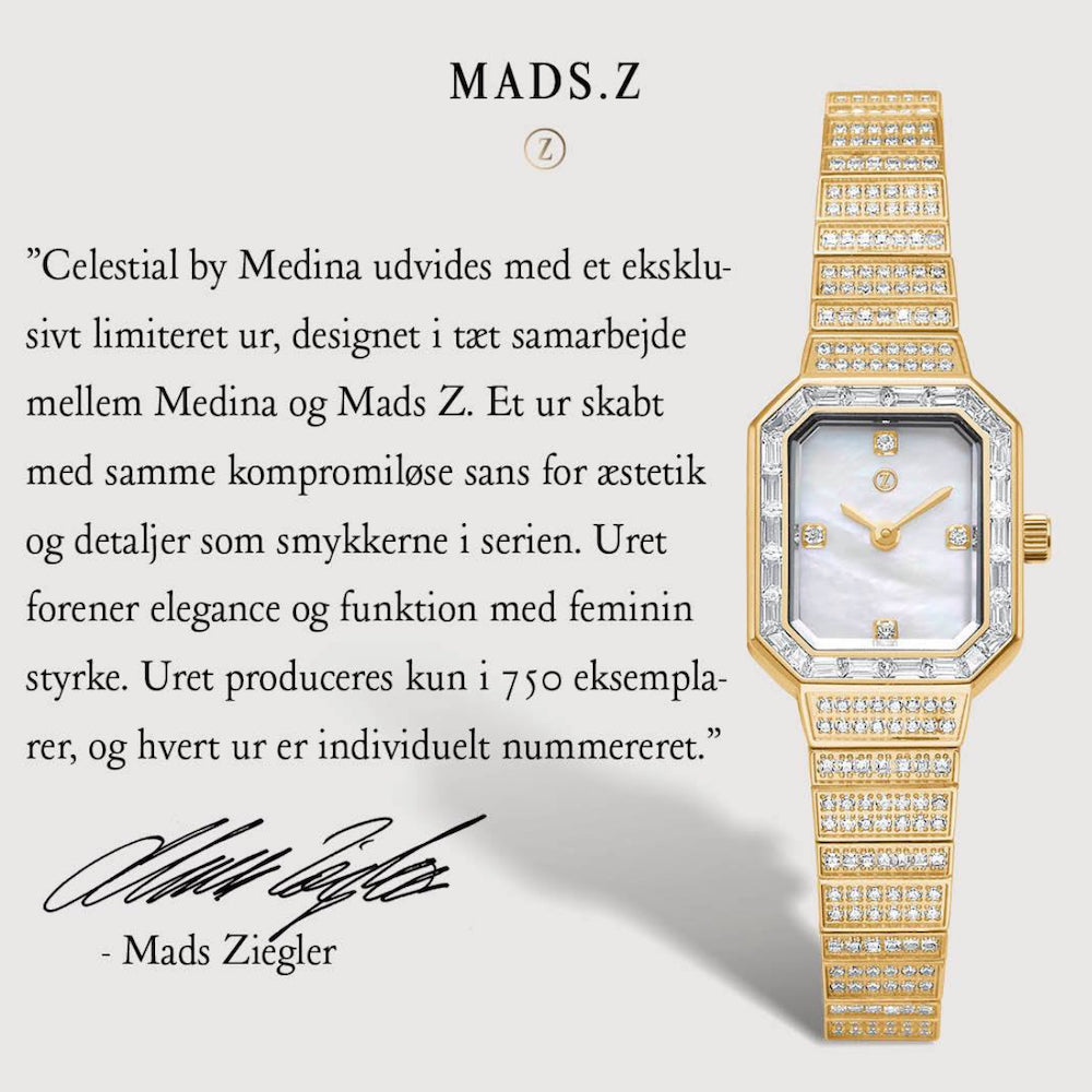 I et designsamarbejde mellem Medina og designer Mads Ziegler forenes dansk formsprog med schweizisk teknologi i Celestial by Medina uret. Tydelige, geometriske linjer møder en ottekantet lynette, mens iriserende perlemor og baguetteslebne sten refererer til nattens stjernebilleder. Urskiven indrammes af PVD-forgyldt stål, og integreret lænke med zirkoniasten sikrer et helhedsindtryk af gennemført håndværk. Uret er en poetisk påmindelse om, at tid er dyrebar, forankret i den kompromisløse kvalitet fra safirglas og schweizisk urværk. De 750 nummererede eksemplarer er ledsaget af et håndskrevet garantibevis for at understrege den personlige relation mellem skaber og bærer.