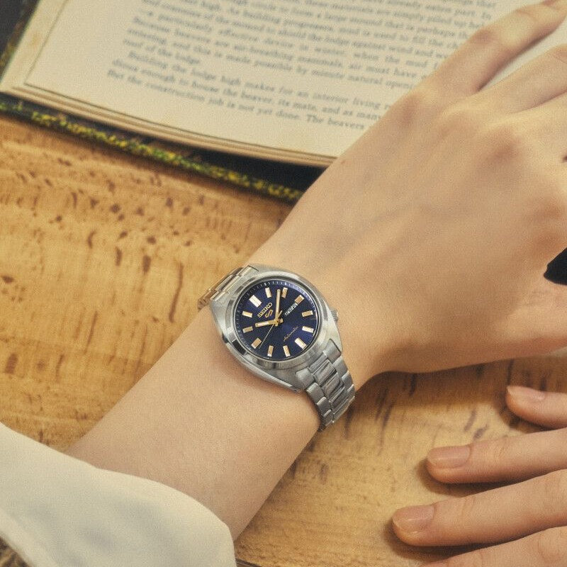 Uret har en dyb blå urskive med tydelige guldfarvede indeks og visere, akkompagneret af en rustfri stålkasse og lænke, der giver et sammenhængende og eksklusivt look. Den blå urskive leverer både stil og god læsbarhed i forskellige lysforhold.