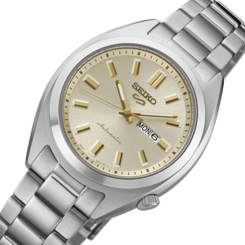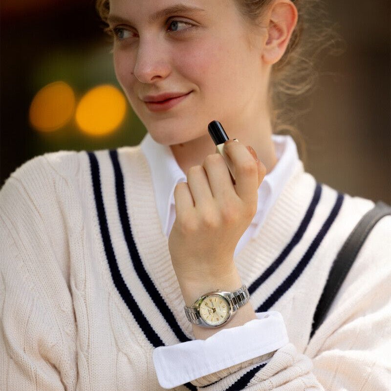 Den varme, cremefarvede urskive giver et tidløst og sofistikeret udtryk, som står flot til den polerede rustfri stålkasse og lænke. Det kompakte format gør modellen ideel til mindre håndled eller som et diskret, men karakterfuldt ur til enhver garderobe.