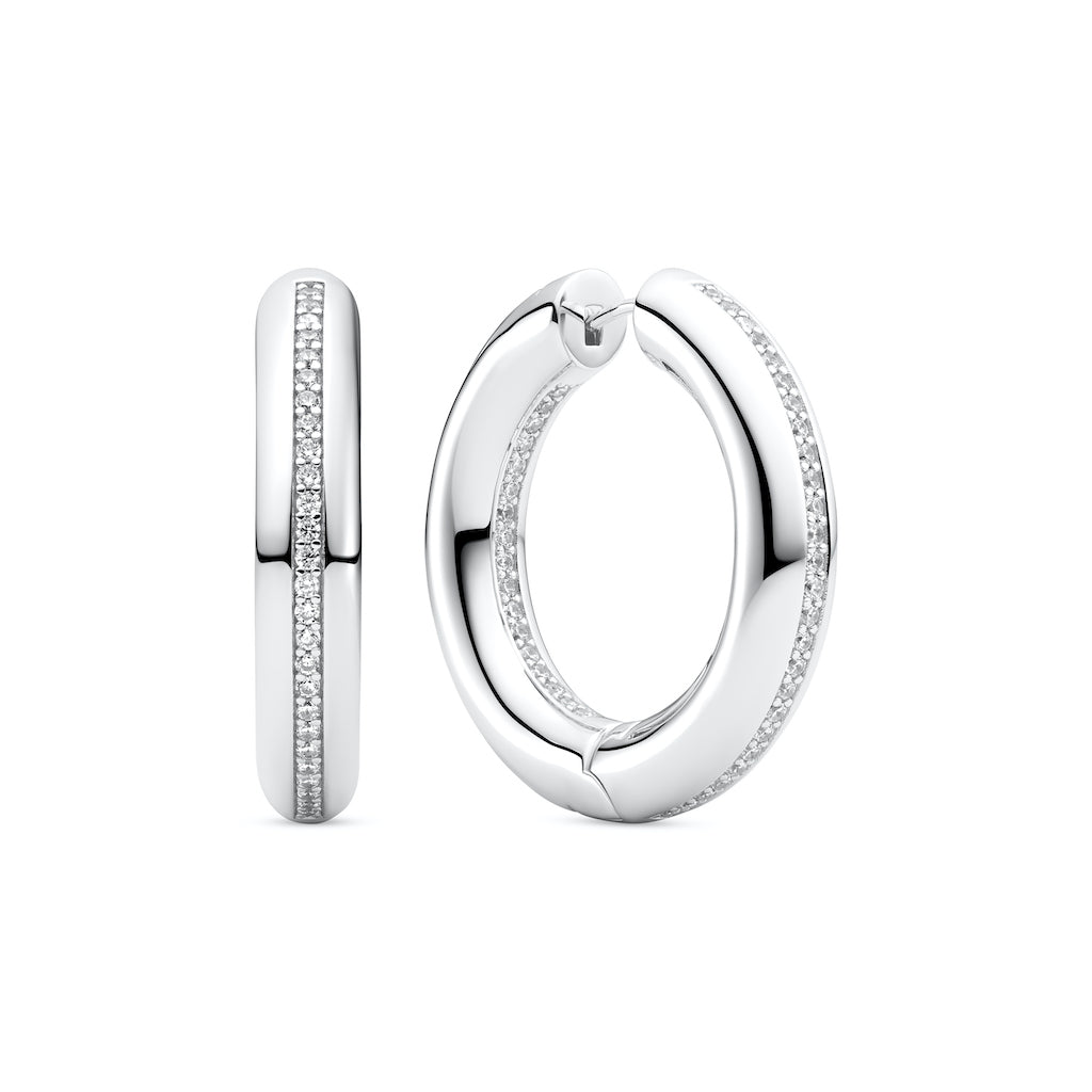 Øreringe af rhodineret 925 sterlingsølv, med en poleret overflade og facetslebne hvide zirkoner.