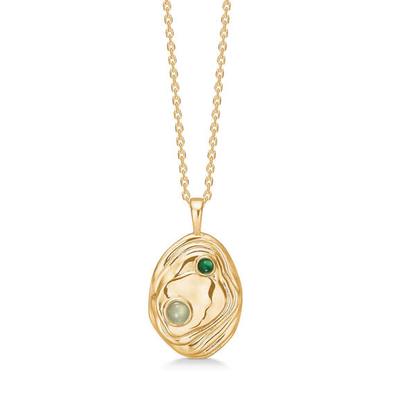Denne elegante halskæde er støbt i 925 sterling sølv, belagt med 18. kt. guld, og er med en grøn zirkonia sten. Shell halskædens unikke tekstur gør, at den er særligt velegnet til hverdagsbrug da ridser og brugstegn ikke vil være så synlige.