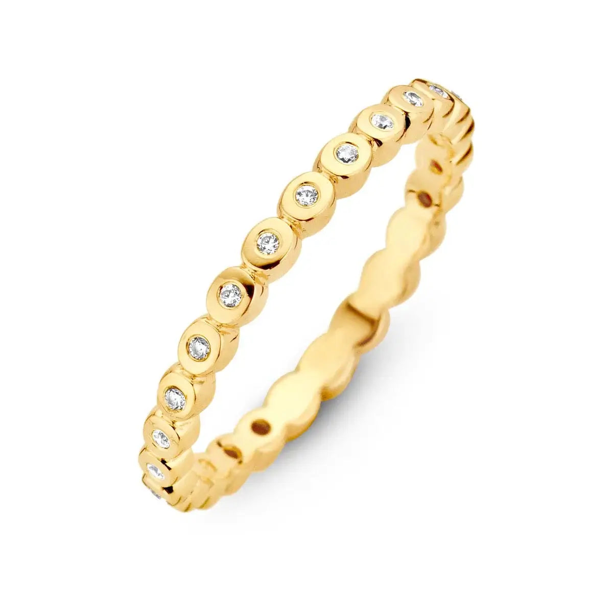 Denne elegante Light ring er udformet med en blankpoleret overflade i forgyldt sterlingsølv. Ringen er designet med små runde overfalder med hver deres funklende zirkon. Ringen er på en gang individuel men også designet til at bæres med andre ringe, hvilket åbner for unikke kombinationer og et mere personligt udtryk.