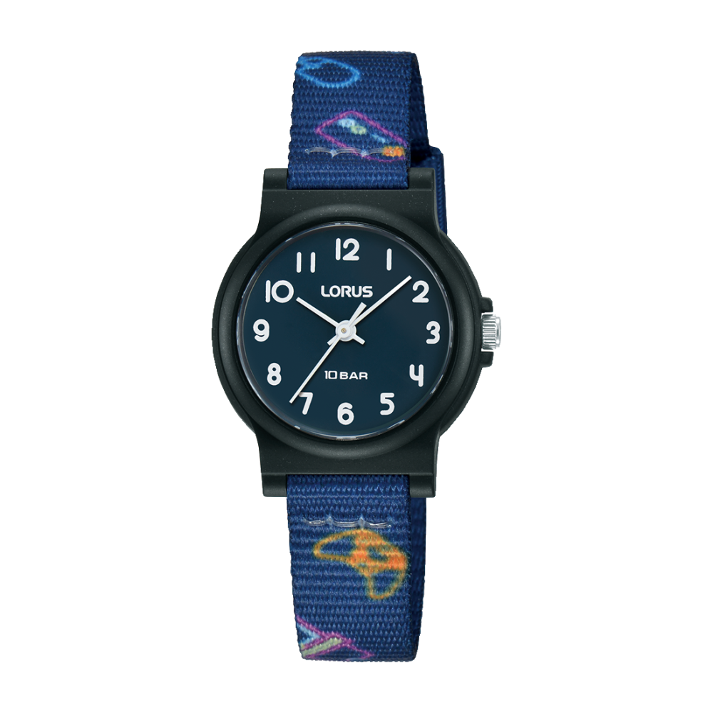 Lorus børne ur med "gamer" motiver på nylon remmen. Urskiven er mørkeblå med sort plastik urkasse.