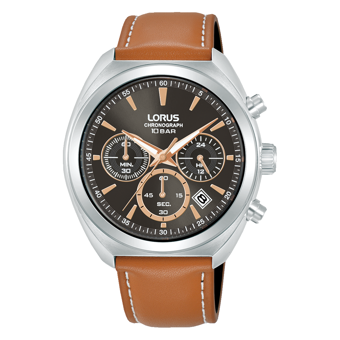 Herreur fra Lorus med stål kasse. Uret har læderrem, er vandtæt til 10 bar og har mineralglas. Skivens farve er mørkegrå med rosa indeks, derudover er uret med quartz værk og chronograph funktion.