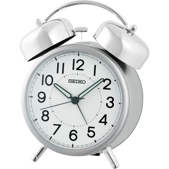 Seiko vækkeur i grå plast med hvid urskive og med sorte tydelige tal og viser. Uret har glidende sekundviser og selvlysende belægning.