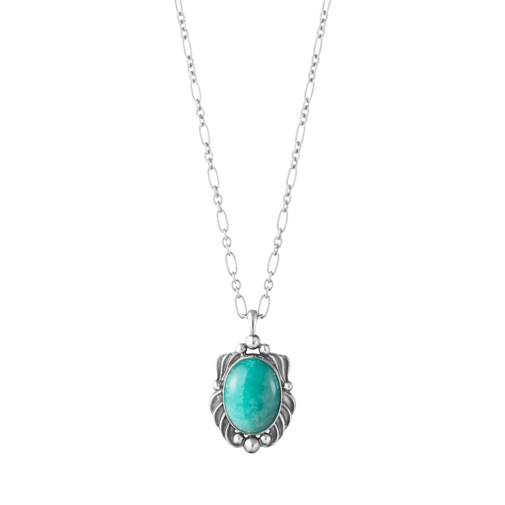 Dette design er hentet fra Georg Jensens arkiv, og det imponerende vedhæng i oxideret sterlingsølv har klassiske stilelementer fra art nouveau-perioden. I hjertet af smykket ligger en smuk amazonit. En unik ædelsten, kendt for sine helende egenskaber. Vedhænget hænger i en enkel sølvkæde og indkapsler Georg Jensens århundredlange designarv i ét fantastisk smykke.