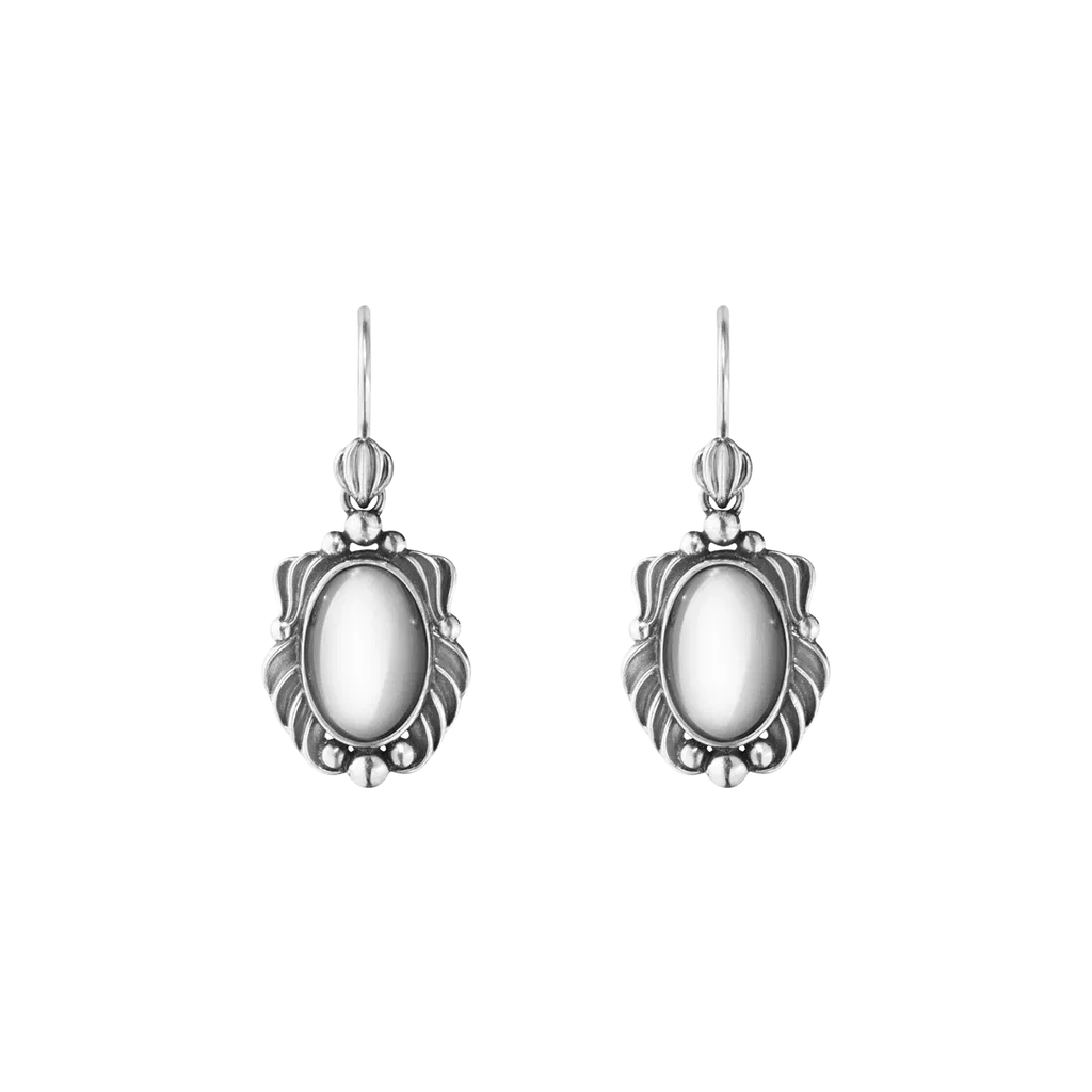 Dette sæt øreringe er en genudgivelse fra Georg Jensens arkiv. Designet er fremstillet i oxideret sterlingsølv og har klassiske stilelementer fra art nouveau-perioden. Øreringene er fra 2025 Heritage kollektionen, og de er et smukt eksempel på Georg Jensens århundredlange designarv inden for sølvdesign.